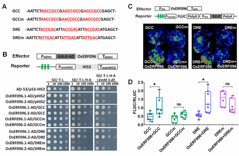图2 OsERF096可以与GCC和DRE顺式元件结合