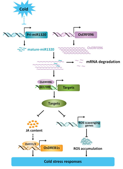 综上所述,miR1320可通过抑制OsERF096的表达,解除OsERF096对JA介导的OsDREB1s信号通路的抑制,正向调控水稻耐冷性。