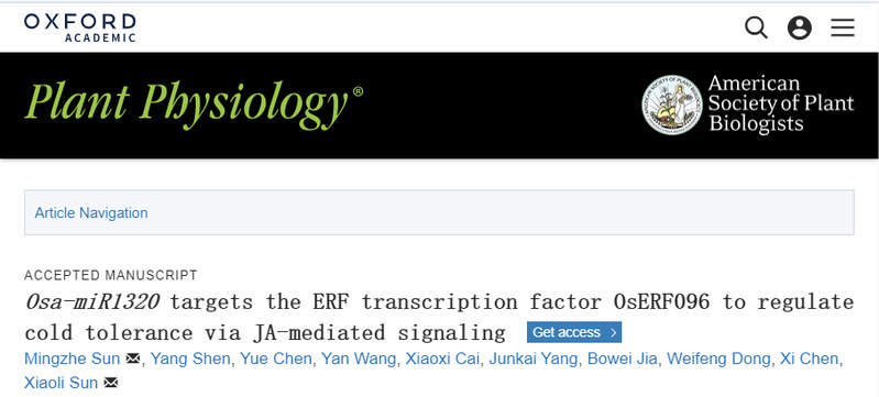 近日,我院孙明哲/孙晓丽团队在国际知名期刊Plant Physiology(中科院一区TOP,IF=8.34)发表了题为“Osa-miR1320 targets the ERF transcription factor OsERF096 to regulate cold tolerance via JA-mediated signaling”的研究论文。该研究鉴定到一个水稻物种特异的microRNA(Osa-miR1320),并揭示了miR1320-OsERF096可通过抑制JA介导的冷信号通路调控水稻冷胁迫应答机制,为培育耐冷水稻新品种提供了重要参考。