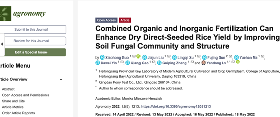 近日,买球赛的app官网“寒地水稻逆境生理生态及种质创新科研团队”在AgronomySCI/中科院二区/IF 3.417)在线发表了题为“Combined organic and inorganic fertilization can enhance dry direct-seeded rice yield by improving soil fungal community and structure的研究论文。本研究发现在基施旺生物有机肥与常规化肥配施条件下,水稻产量增加,且与子囊菌群和孢囊菌群的相对丰度呈正相关。使用基施旺生物有机肥与常规化肥配施可提高真菌群落多样性和水稻产量。