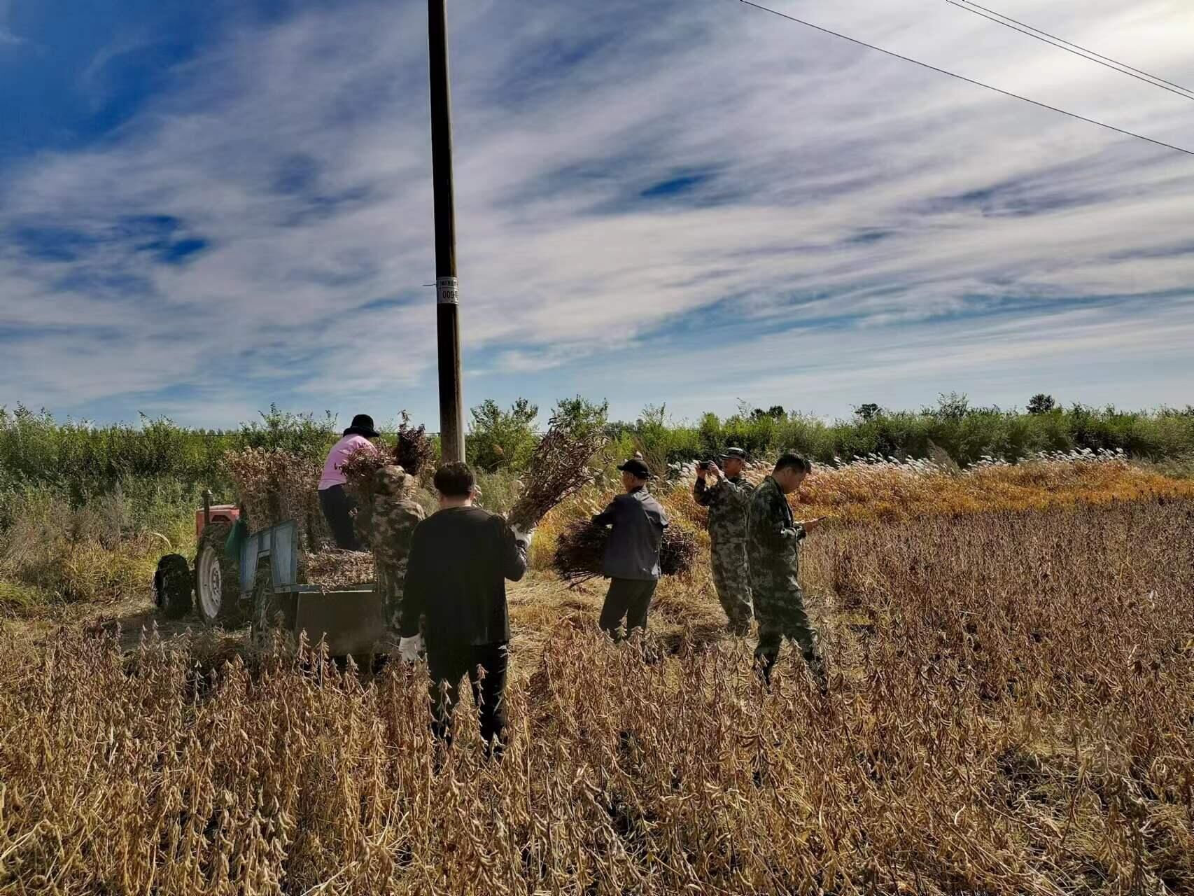 得知这一情况,9月25日,密山市援边工作队队长带着十余名队员利用周末休息时间,来到了科研所的试验田帮忙抢收大豆。由于作为科研材料的大豆选种专业化、精细化程度高,工作队就负责将专业技术人员选种、收割、打捆的大豆从地里背出来装上车。经过一上午紧张忙碌的劳动,共完成收获大豆育种选种圃的F2、F3、F4代材料,共计6000多株。