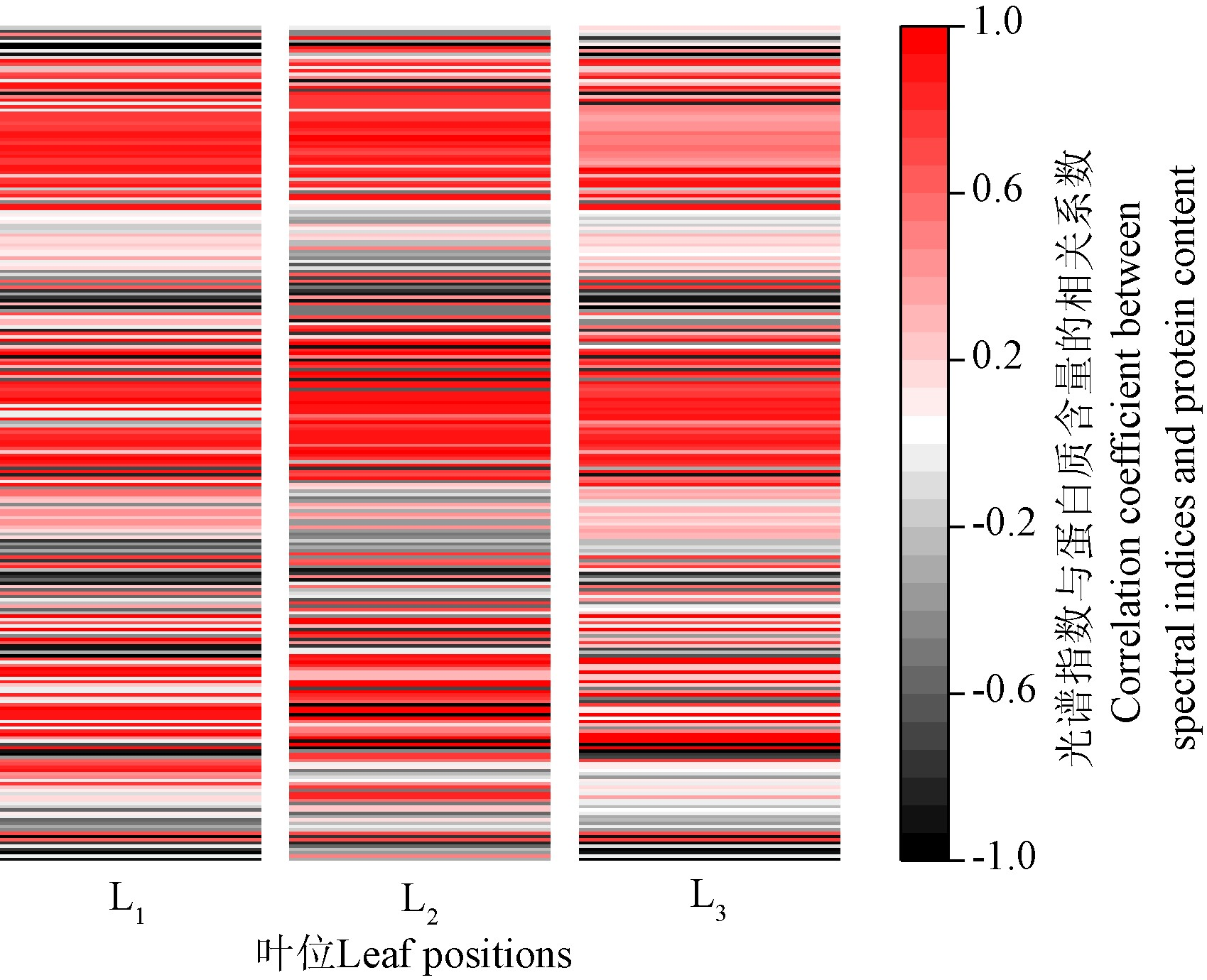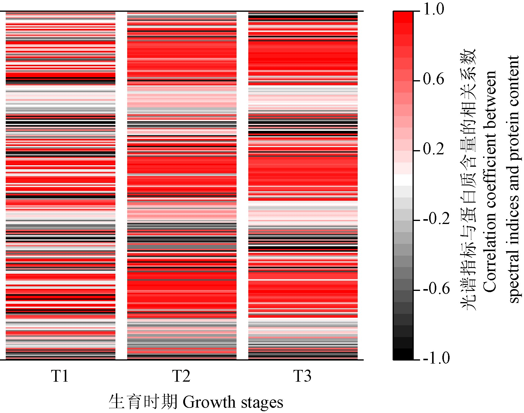 作者基于相关分析和回归分析,探究了不同叶位构建的特征光谱指数与稻米氮素营养之间的关系,并通过光谱指数与稻米蛋白质含量的相关性,筛选出了能指示稻米氮质量分数的优等时期、叶位及最佳光谱指数。结果表明,T2时期(齐穗期)的光谱指数与稻米蛋白质含量相关性优于其他时期(图1),顶部第二片叶(L2)的光谱指数与稻米蛋白质含量相关性优于其它叶片(图2)。