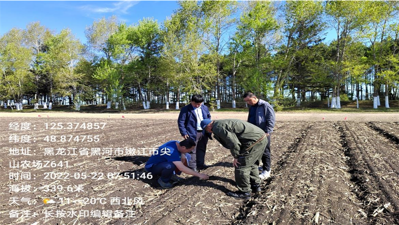 2022年5月,张玉先教授深入尖山农场大豆高产创建示范田,对播种质量、土壤含水量进行有关调研,针对种植情况对春季播种工作给予指导性意见。