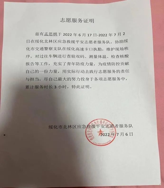 6月17日在绥化北林区应急救援平安志愿者服务队,协助绥化市交通警察支队在绥化高速卡口执勤,维护现场秩序,对过往车辆进行查验双码、测量体温、检查核酸报告等工作。在志愿者中,有很多这样平凡的人配合警察工作,没能留下一张志愿时的照片是她的小遗憾,她说:“在这次短短三天时间内,我在工作中学习到工作者的不易和辛苦,有很多人不配合,让我着急又害怕出错,但是有很多义警在我旁边,让我很有安全感,并且觉得这份工作很有意义,很有动力。”