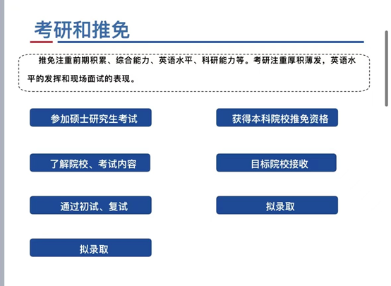 玉外从保研申请条件,遴选办法,保研时间规划,夏令营途径和投递战略,四个方面向同学们分享了自己的经验。关于研究生推免,能力考核内容包括:科研成果奖;科技发明与专利;学术著作、学术论文;主持并完成省级以上大学生创新创业项目;获得省级以上各类专业竞赛、创新创业竞赛奖励等。她指出,3-5月为信息收集阶段,查询目标学校,记录该学校近两年夏令营、预推免时间和要求,可以做初步的准备。5-7月应当及时关注相关学校夏令营信息,记录填报时间和需要准备的材料。9月初-9月28日进行预推免填报、准备、面试。玉外提醒同学们要注重成绩,特别是第一课堂成绩占90%,科研占10%,鼓励大家认真学习。社会实践,让大家注重团队协作和机会,多参加多体验。在结束时,寄语即将面临考研的同学们,“路虽远,行则将至。事虽难,做则必成”。