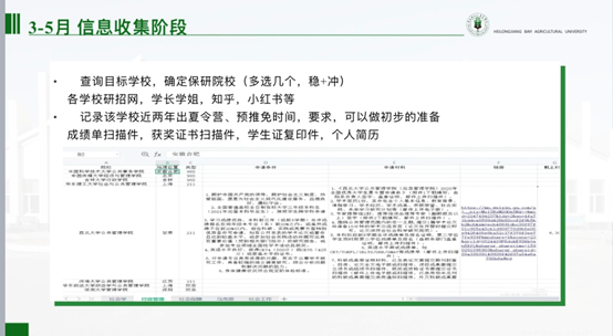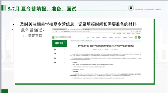 谷全伟从择校,推免的流程,夏令营的经验三个方面为同学们进行讲解。他提到,推免注重前期的积累,综合能力,英语水平,科研能力等。考研注重厚积薄发,英语水平的发挥和现场面试的表现。他以南京农业大学为例详细为同学们讲解了近两年考取硕士研究生的报录比和复试要求,同时还与大家分享了制定时间规划的重要性,不要让自己的大学生活碌碌无为。最后,谷全伟寄语在座同学们“贵有恒,何必三更眠五更起,最无益,莫过一日曝十日寒”。希望同学们能够坚定自己的内心,相信自己,愿你我都能顶峰相见!