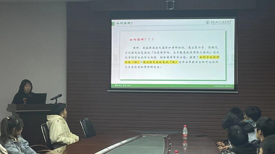 于洋从考研前期的准备,政治英语的复习,复试前的准备工作三个方面为同学们进行讲解。她提到,前期的准备工作需要确定好心仪院校,找好官网考研大纲,询问已经上岸的师兄师姐去寻找资料。她强调:“无论你选择什么院校,考上了才是研究生,一定选择自己最适合的学校”。同时,她也分享了考研英语和政治比较好的资料和专业的老师,提醒大家在考研的过程中也要保持良好的心态,积极的面对生活,多运动,多与人沟通。最后,于洋希望同学们能够找到一条最适合自己的道路,坚定不移的走下去,不负青春,不负自我。