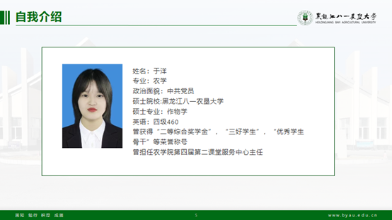 于洋,农学院第四届第二课堂服务中心主任,目前已考取黑龙江八一农垦大学硕士研究生。