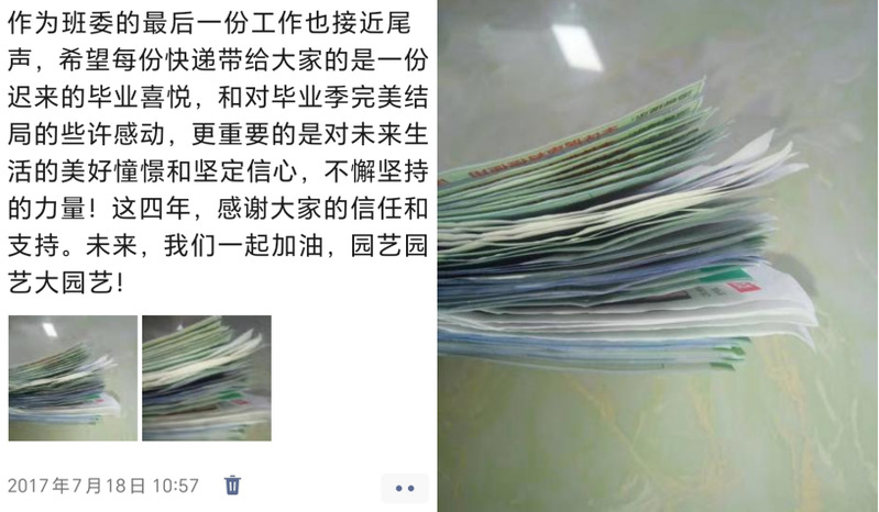 然而无论我们怎样地想抓住,大学四年就在一顿顿所谓的“散伙饭”里结束了,就在一次次挥起的手和一句句“一路平安”里结束了,就在大家一起高高扬起学士帽的时候结束了,就在一份份的毕业证和毕业照被我寄出后结束了。