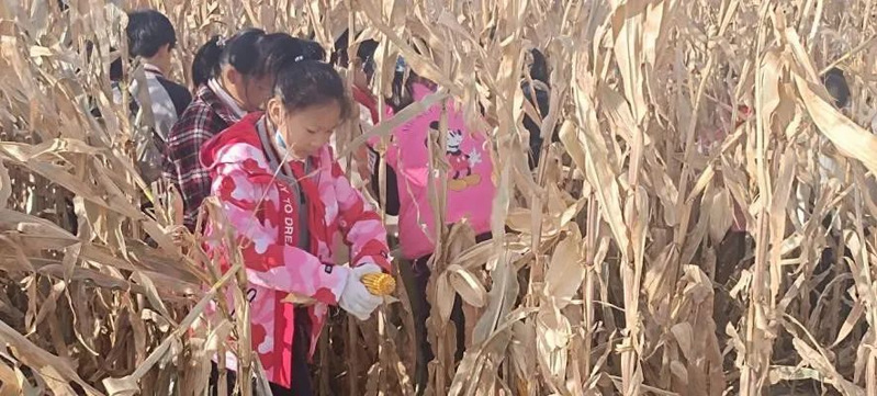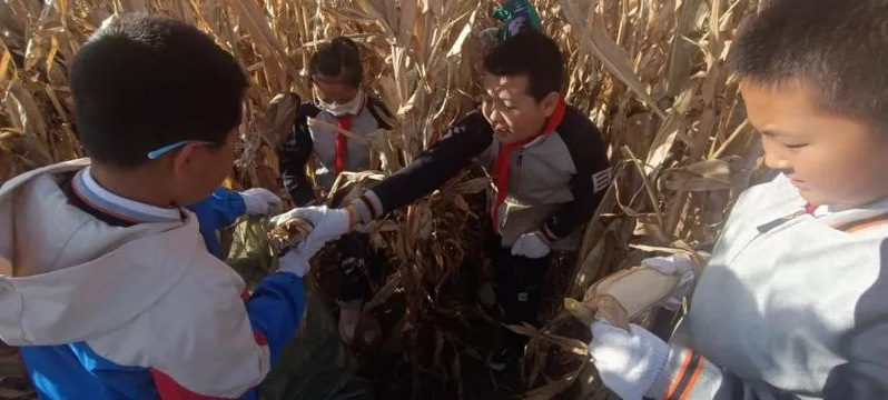 在园区玉米地里,赵良琦老师向同学们介绍了玉米的生长习性和实用价值,并示范给学生如何掰玉米。同学们按照示范,有模有样的劳动起来,学生们分组合作,有序地穿梭在玉米地里,你争我赶,热火朝天,忙的不亦乐乎,不一会儿,一穗穗玉米就堆成了“金山”。