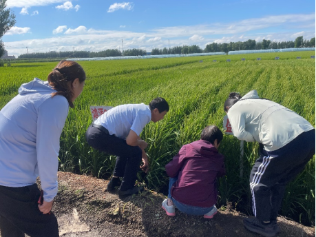 8月5日,农学院专家组一行三人在通河县农业技术推广中心主任魏冲的陪同下,对当地水稻的田间长势、生育进程及病虫害等进行了实地踏察。因近期连续阴雨天气,田间湿度大,加上耕种地块连年全量秸秆还田,个别水稻品种纹枯病发生较为严重。郑桂萍教授指出,水稻拔节期前后,田间郁蔽,温度高、湿度大,纹枯病发生几率高,应注意在发病初期使用高效适用药剂防治,或结合防治稻瘟病等其它病虫害综合用药