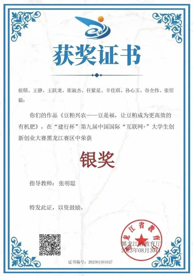 “建行杯”第八届黑龙江省“互联网+”大学生创新创业大赛银奖