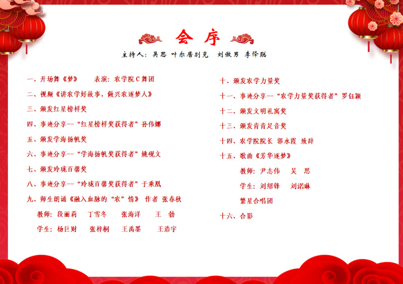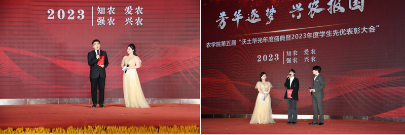 大会颁发了红星榜样奖、学海扬帆奖、玲珑百馨奖、农学力量奖、文明礼寓奖、青青足音奖六项奖项,分别表彰在党建引领、学风寝风、第二课堂、学生骨干培养、社会实践及志愿服务等方面表现突出的学生先进个人及集体。大会在舞蹈《梦》演绎出的美好丰收场景中拉开帷幕,在2023年农学院学生工作回顾视频《讲农学好故事,做兴农逐梦人》中开场。颁奖过程中穿插优秀代表事迹分享、采访等环节,激励广大同学向优秀榜样看齐。