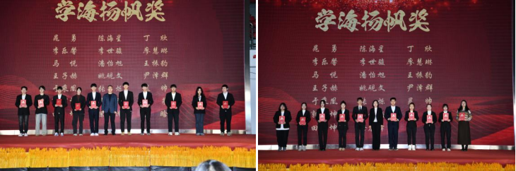 图片学生工作部、学生处处长金耀武、校团委书记李颖颁发学海扬帆奖
