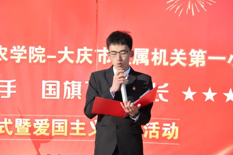 为进一步加强爱国主义教育,引导学生厚植家国情怀,按照校团委《关于组织开展爱国主义教育-“国旗下共成长”主题升旗仪式的通知》要求,结合学院特色育人系列活动,4月1日,在学校八一广场,农学院邀请大庆市直属机关第一小学校20余名师生代表来校,共同开展“大手拉小手 国旗下共成长”主题升旗仪式暨爱国主义教育活动。机关一小书记宋德印、政教处主任孙文超、党办主任马力波,农学院党委副书记王洋、分团委书记丁雪冬、全体辅导员、学生骨干及本科学生近1200人参加了活动,仪式由学院兼职团委副书记李怿聪主持。