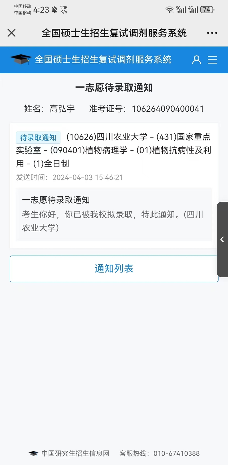 4号床,高弘宇,2020级植物保护专业学生,考取四川农业大学,砥砺前行,不负时光。