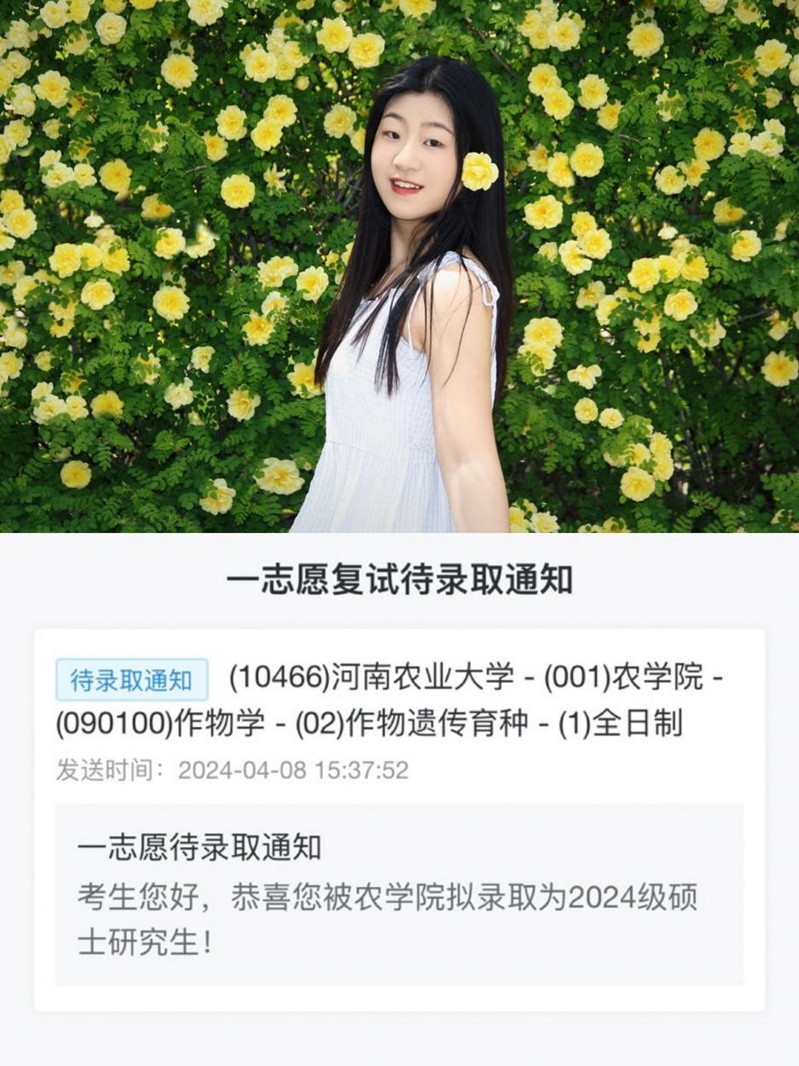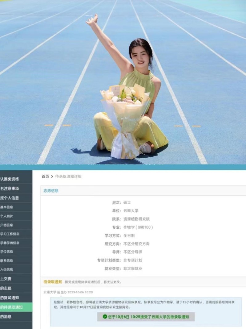 农学院2020级农学二班任紫星,共青团员,现已推免至云南大学。曾被授予三好学生等荣誉称号,获校二等综合奖学金等奖励。