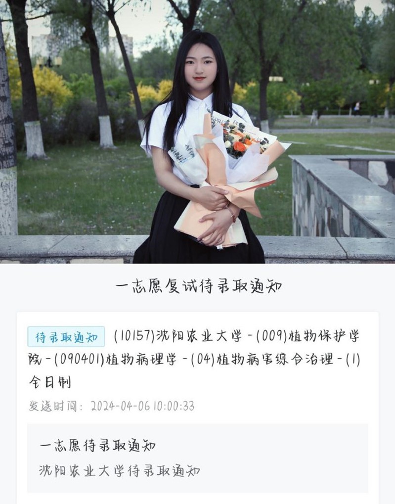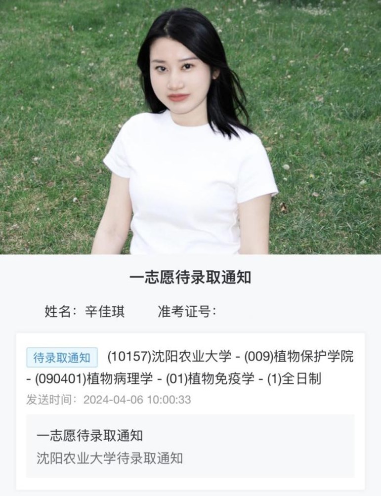 农学院2020级农学二班辛佳琪,中共党员,现已被沈阳农业大学录取。班级团支书,曾任农学院学生会副主席