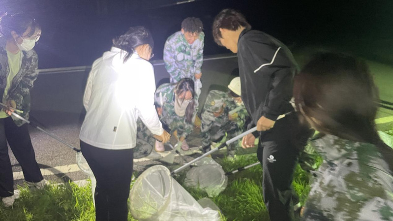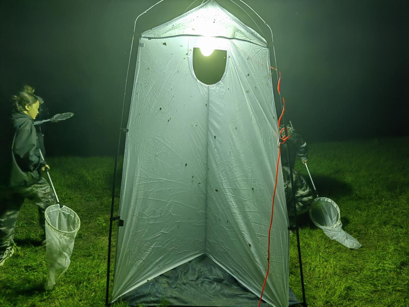 当天色完全暗下来后,师生们在空旷地搭起诱虫帐,当打开500W的白炽灯,利用昆虫的趋光性,铺天盖地的小型蛾类、绿尾大蚕蛾等昆虫纷至沓来,它们在灯下萦绕飞舞或者停歇在诱虫账上,大家兴奋的围在灯帐前,捕捉了一只又一只的“战利品”。