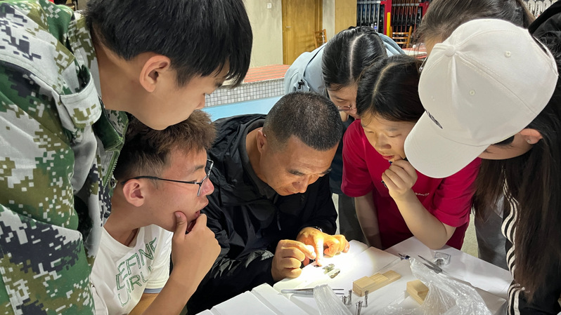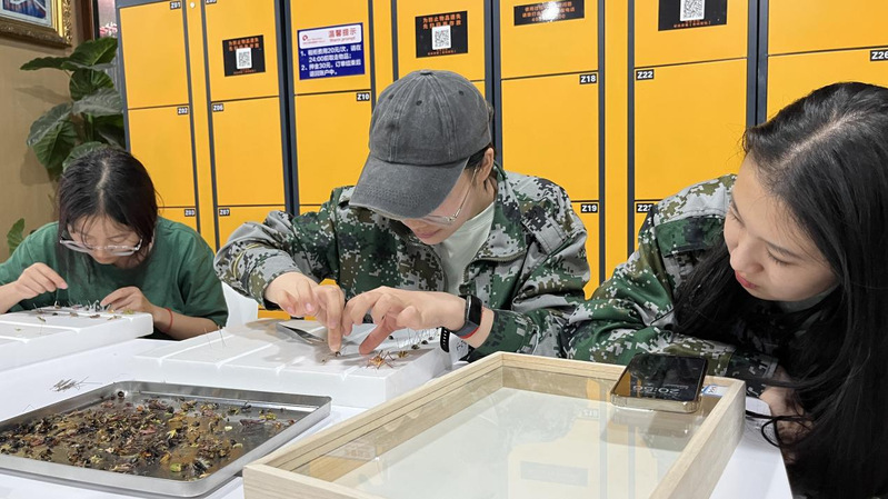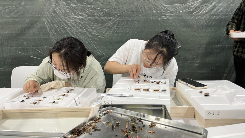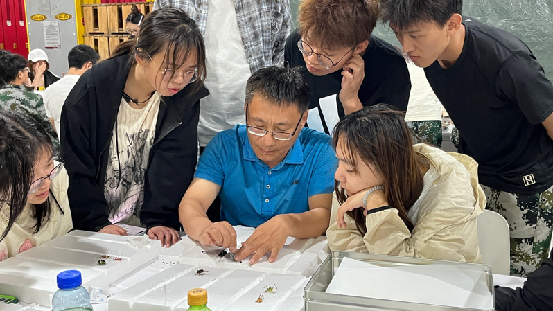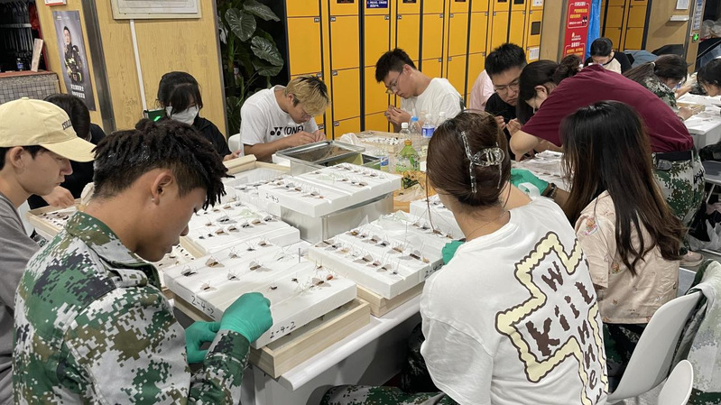 晚餐后,各组同学将白天的“战利品”在教师的指导下进行分类鉴定,并进行整姿,使标本的姿态与活体状态一致,然后用昆虫针将虫体插到标本盒中。