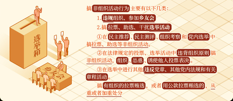 党内选举是党内政治生活的重要组成部分。《关于新形势下党内政治生活的若干准则》规定,党内选举必须体现选举人意志,坚决防止和查处拉票贿选等行为。在选举活动中搞非组织活动,干扰选举人表达选举意愿,侵犯其他被选举人权益,侵蚀党内政治文化,在党员群众中造成不良影响,对这类违反组织纪律的行为必须予以坚决惩治。