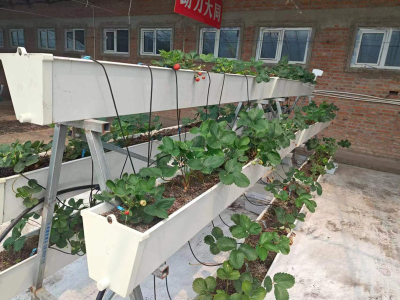 随后,我们参观了草莓种植园区,在棚内,草莓植株盆内均由“滴箭”,盆与盆之间有管道相连,水肥通过这些联通装置滴进盆内,滋养草莓,通过多种传感器、集成器实时将植物生长信息传回到电脑中,再由系统根据信息进行水肥的调配,就这样,采用自动化、智能化的种植管理技术,精确控制,从而提升草莓品质。