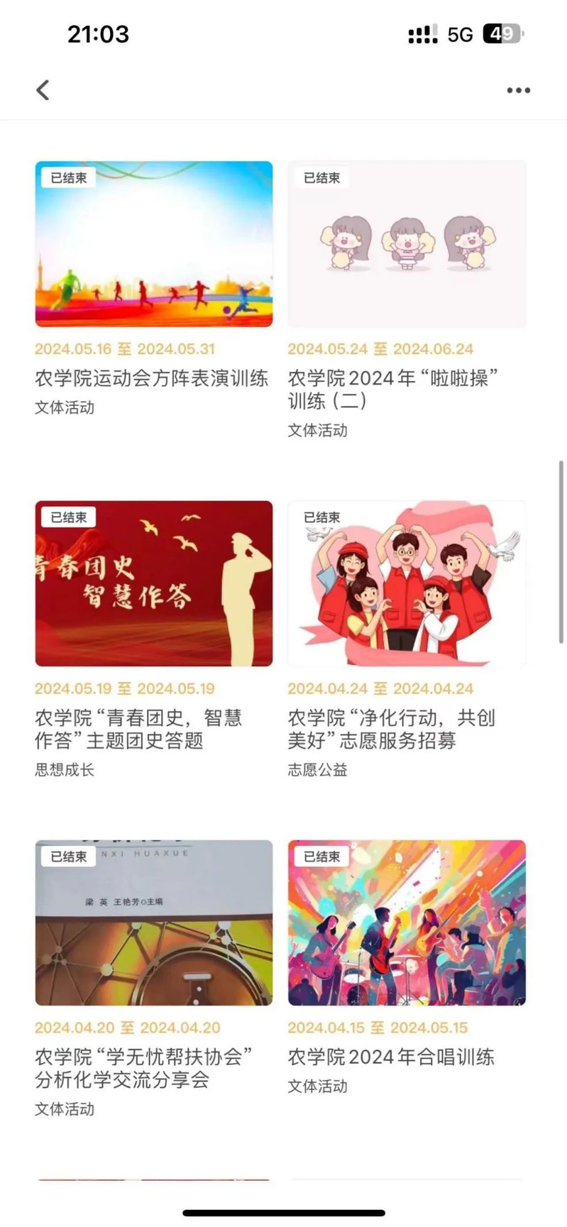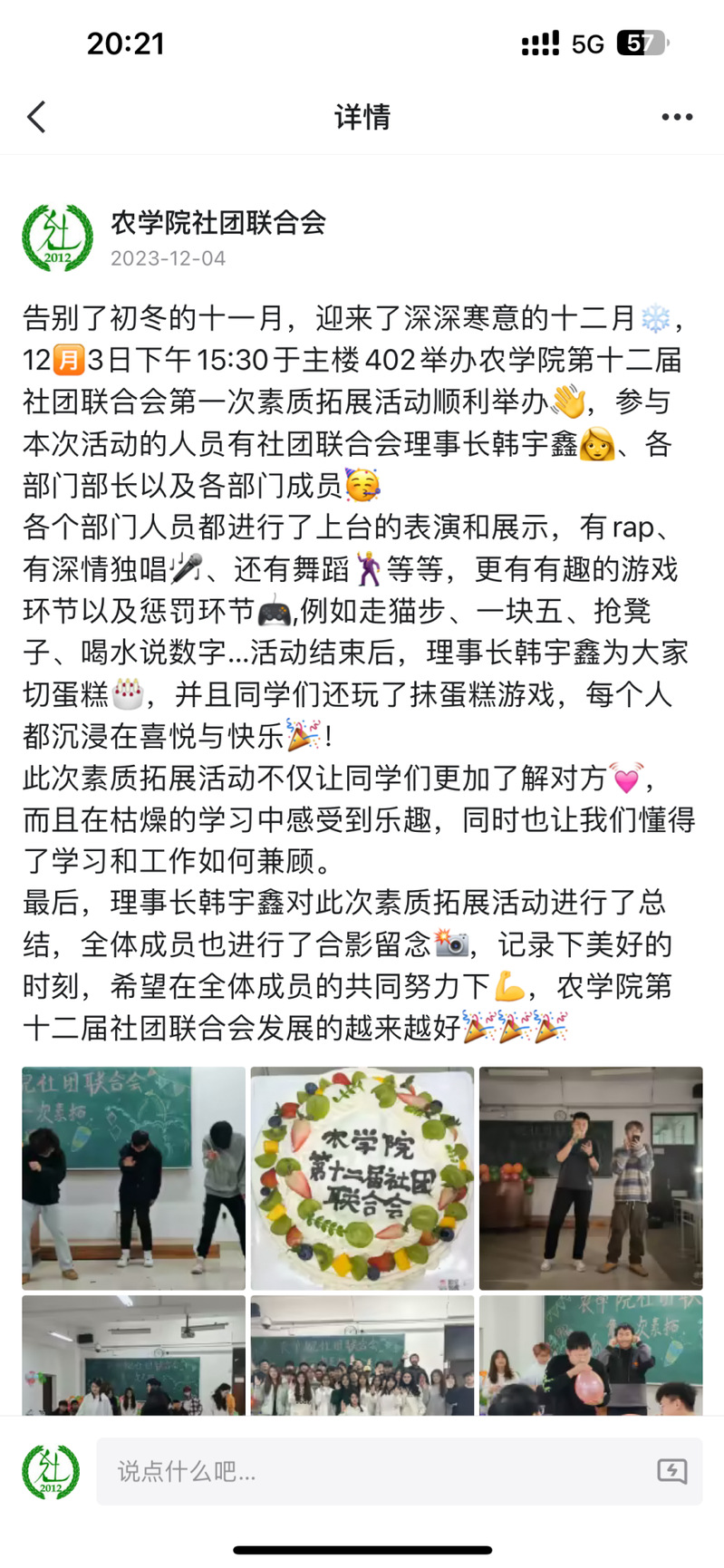 农学院社团联合会曾开展“班歌比赛”,“社会实践表彰大会”,“十佳歌手大赛”,“民族文化节”,“啦啦操比赛,“自由舞比赛”,“演讲比赛”等大型文化活动。