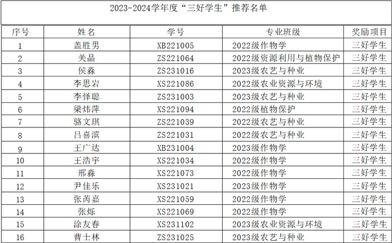 根据学校《关于评选2023-2024学年综合奖学金、先进集体和先进个人的通知》要求,依据《黑龙江八一农垦大学本科生奖励规定》,经自主申报、资格审核、班级测评、评审委员会评审,最终推荐盖胜男等16名研究生为校级“三好学生”荣誉称号,现予以公示,详细名单见附件。