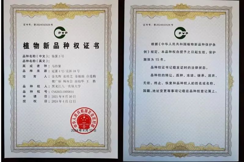 近日,垦薯3号马铃薯新品种的植物新品种权证书正式下发,该品种是黑龙江省科技厅马铃薯揭榜挂帅项目“高淀粉高产广适性马铃薯种质资源创新与新品种选育”的主要成果,也是买球赛的app官网继垦薯1号、垦薯2号淀粉加工专用型马铃薯品种选育推广之后的又一淀粉加工专用型品种。买球赛的app官网马铃薯种质资源创新及新品种选育团队秉承北大荒精神艰苦奋斗、勇于开拓,深耕科研育种多年,先后培育优秀马铃薯新品种6个,已成果转化4个,垦薯3号是继培育出高端鲜食品种红粉佳人且于2022年获得国家新品种保护授权品种之后,又一获得新品种保护授权的新品种。