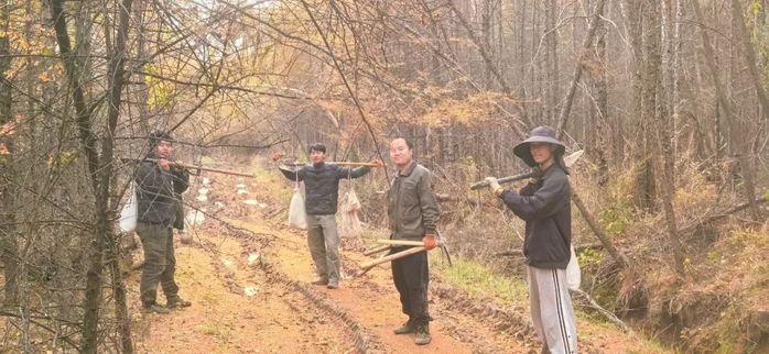 为了防范东北虎来袭,大家每人都手持“武器”,队伍中还配备了音响设备。