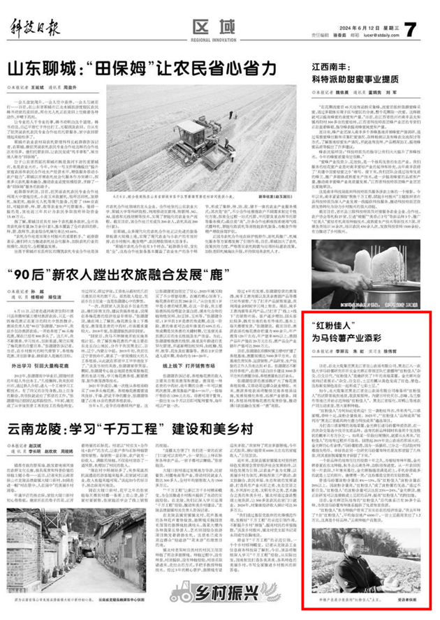 马铃薯种质资源创新及新品种选育团队、大豆栽培创新团队、盐碱地改良创新团队的事迹先后被科技日报、中国科技网、东北网、大庆晚报等多家媒体报道。《科技日报》2024年6月12日第7版讯,“红粉佳人”为马铃薯产业添彩,‘红粉佳人’品种成果被列为“黑龙江省最具转化潜力科技成果”遴选项目。