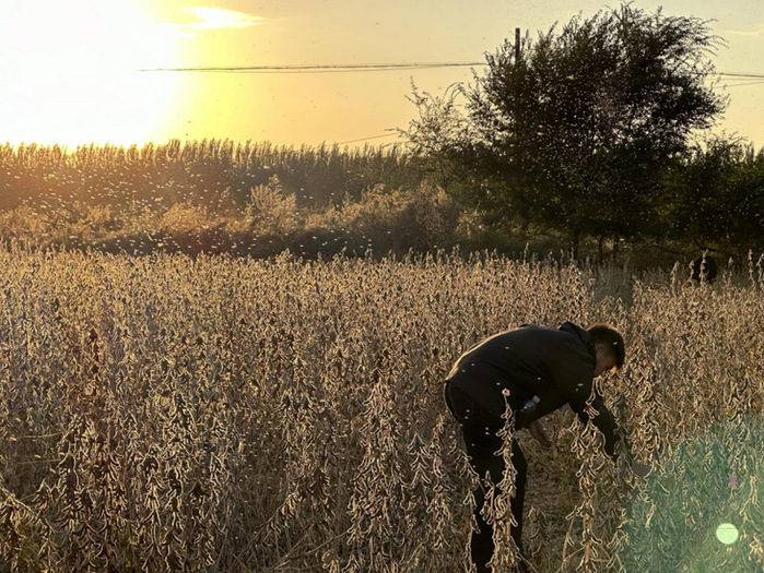 这些秋收最烦人的公敌—小咬,无时无刻不对我们狂轰乱炸。夕阳+小咬+豆田+农学人=美景!