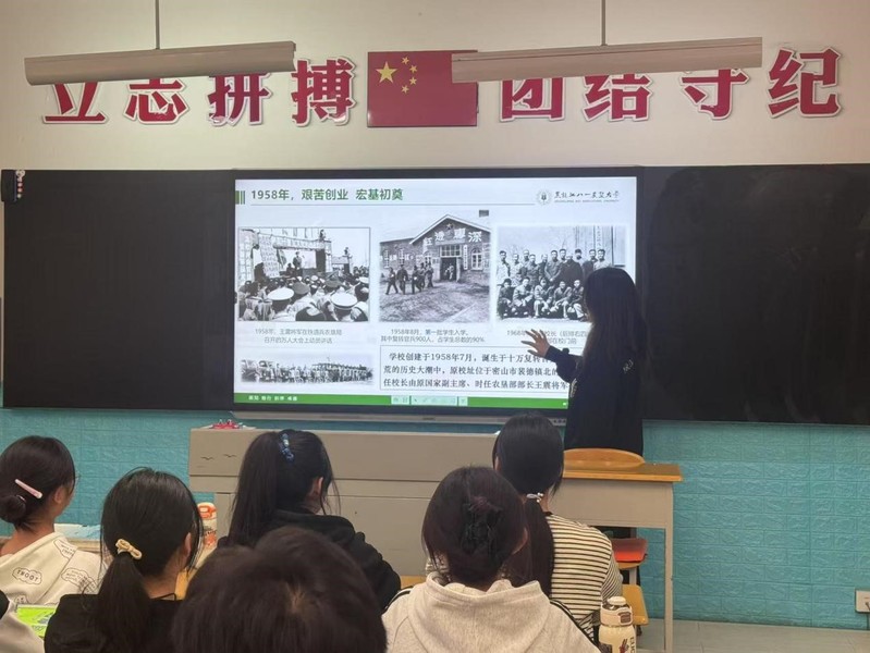 成国正同学主要介绍了学校的发展历史,校区规模以及教学机构,介绍北大荒精神、大庆精神、铁人精神,鼓励学弟学妹们报考黑龙江八一农垦大学。