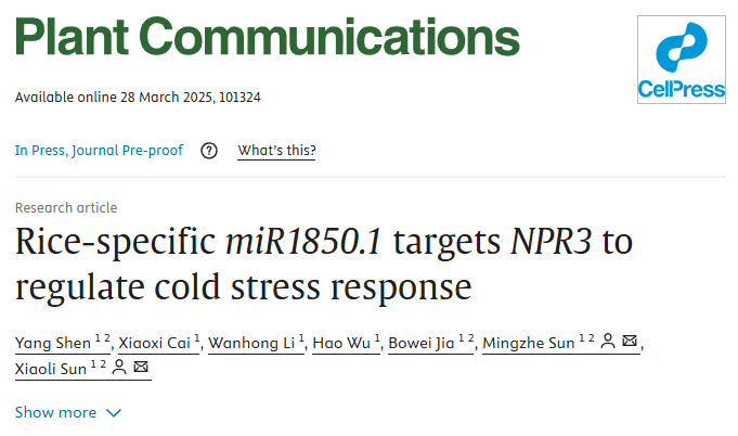 农学院孙晓丽/孙明哲团队在国际知名期刊Plant Communications(中科院一区TOP,实时IF=10.9)发表题为“Rice-specific miR1850.1 targets NPR3 to regulate cold stress response”的研究论文。该研究以负调水稻苗期和孕穗期耐冷性的miR1850.1为切入点,揭示miR1850.1通过抑制NPR3表达平衡水稻产量和耐冷性的分子机制,该研究有助于深入理解水稻生长和抗性平衡的遗传网络,为耐冷高产水稻新品种培育提供精准靶点和科学依据。