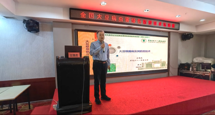 培训班上,农学院植物保护学科带头人、黑龙江省作物有害生物互作生物学及生态防控重点实验室主任左豫虎教授就“大豆根腐病及其防控技术”向大会作专题报告。