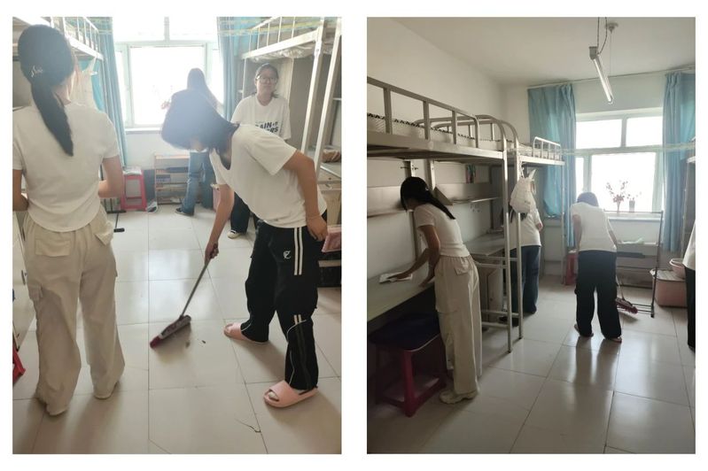 志愿者们手持扫帚、抹布等工具分组行动,仔细擦拭门窗玻璃、清理墙角积灰,将桌椅归置整齐,连床底角落的杂物都一一清扫。原本因搬迁略显凌乱的宿舍,在他们的忙碌中恢复了窗明几净的模样,地板倒映着灯光,书桌整齐如新。