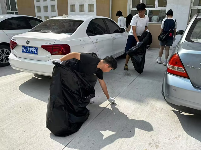 活动中,王勃老师向志愿者们强调了劳动教育的重要意义,明确分组分工与清扫标准,要求全体人员秉持“不放过一处污渍、不遗漏一片垃圾”的原则,对学院周边环境进行彻底清洁。志愿者们迅速行动,手持扫帚、垃圾袋、抹布等工具,有序开展清扫作业。劳动过程中,全体志愿者不畏高温酷暑,相互配合、协同作战,不仅展现出高度的责任感与团队协作意识,更以实际行动践行 “奉献、友爱、互助、进步” 的志愿精神。经过近 4 小时的集中清扫,学院内外地面整洁度显著提升,公共设施焕然一新,绿化带杂物得到彻底清理,整体环境面貌焕然一新。