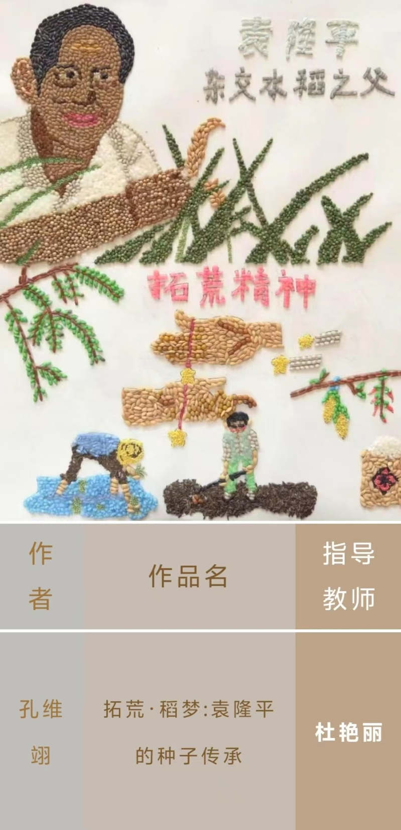 创作背景源于对袁隆平院士“拓荒”精神的敬仰。袁老一生扎根农业,以科技为犁,在粮食增产、保障粮食安全的土地上拓荒,这种勇于突破、默默耕耘的精神,与“拓荒”内核高度契合。同时,种子承载着生命与希望,用种子拼贴创作,既能以独特艺术形式致敬袁老,又能让“拓荒精神”借自然物料传递,唤起人们对农业奉献者、对开拓进取价值的关注 。作品以种子为基本素材,上层精心拼贴袁隆平院士肖像,选取色泽、形状适配的种子,通过疏密、层次排布,还原院士面容轮廓与神态,展现其慈祥与坚毅。下层以种子构建“拓荒”场景,借不同种子模拟土地、农具、奋进的身影等元素,呈现垦荒、耕耘的动态画面。整体将袁老形象与拓荒意象融合,以种子的自然质感,传递袁隆平院士在农业科研领域拓荒前行,为守护粮食安全倾尽一生的伟大精神,让观众在感受种子艺术魅力时,铭记先辈奉献,传承拓荒担当。