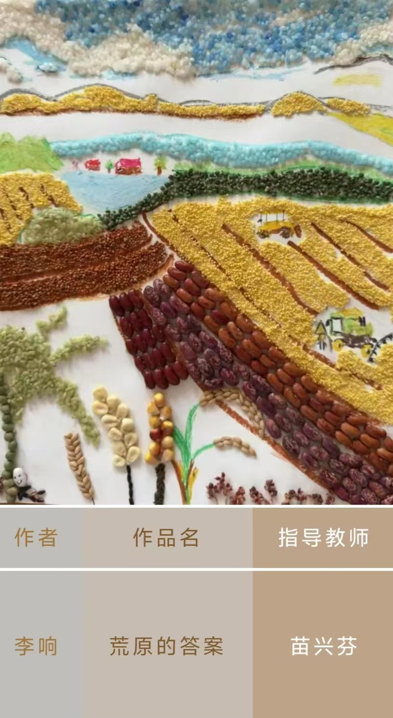 创作灵感来源于北大荒这片曾经荒芜却被开垦为“中华大粮仓”的土地。画面中,蓝天白云下是连绵的山 丘与金黄的田野,红色的小屋点缀其间,传达出农人扎根土地的朴素生活;远处的拖拉机正在田间耕作,象征着现代农业的发展,也致敬一代代垦荒者的辛勤付出。我以北大荒精神和农耕文化为核心创作的一件手工拼贴作品。作品所用的每一粒种子,都是从大地中孕育而来,用最原始、最质朴的材料,回应那片曾经沉默的土地. 北大荒,曾是一望无际的荒原,如今却成为了“中华大粮仓”,它的巨变是无数垦荒人用汗水与信念写下 的答案!我将这份历史与精神凝练在画中:广阔的田野、翻滚的稻浪、耕作的拖拉机、静默的小屋,都是对“荒原如何变成家园”这个命题的回答. 种子,是最小的生命单元,却也藏着最厚重的希望。我用真实的玉米、豌豆、稻谷、香菜,芸豆等种子 拼贴出大地与农作物的形象,试图还原一幅丰收又温暖的乡土画卷,它不仅仅展现了一种自然景象,更寄托着我对脚下这片黑土地的深情,以及对农耕文明的敬意. “荒原的答案”,是奋斗,是坚持,是一代人深埋土地的梦想和不言放弃的信仰。这幅作品,是我对他们最真诚的致敬,也是身为土地子孙的一种回望与铭记。