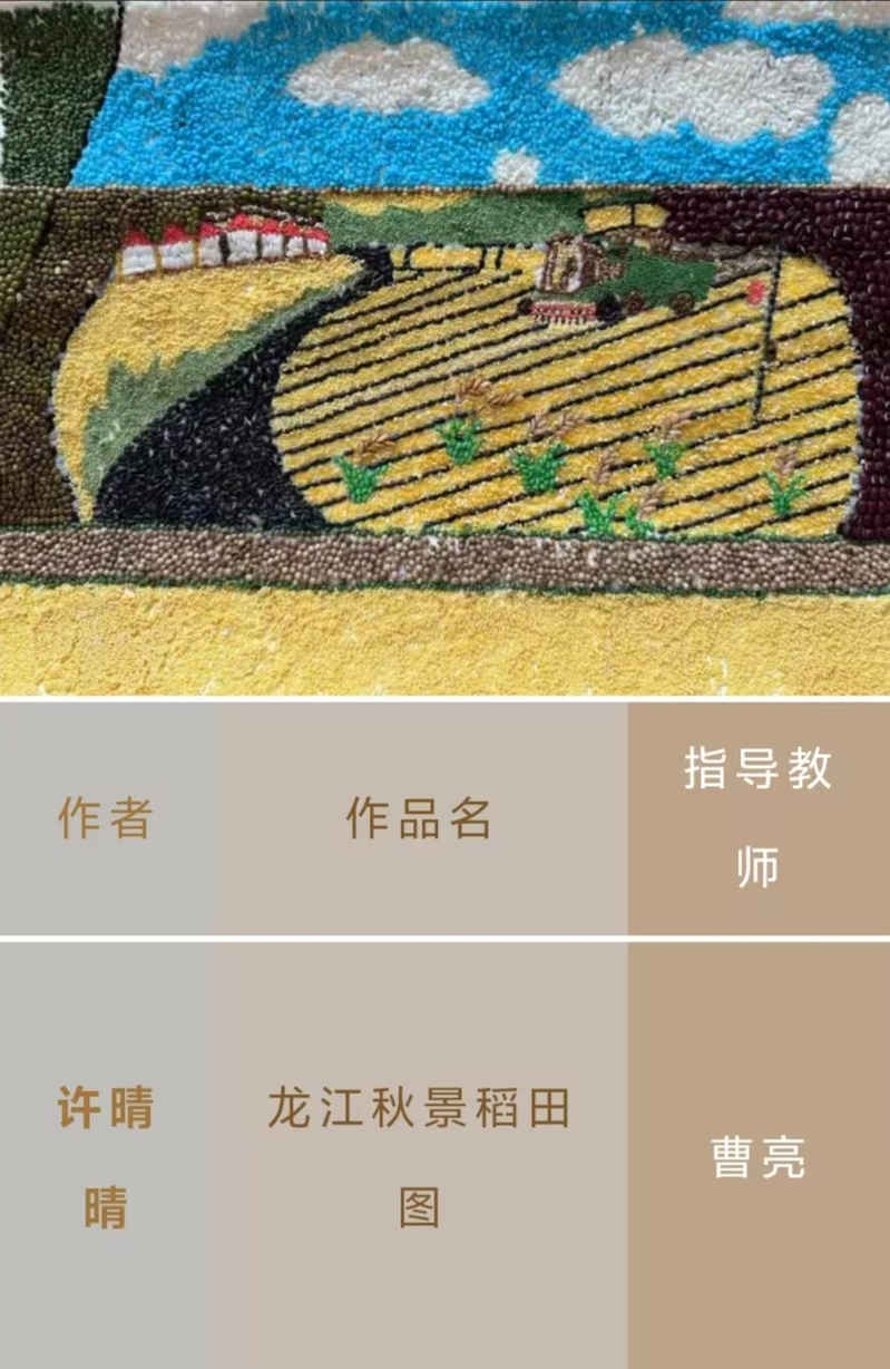 “龙江丰收稻田图”的灵感源自黑龙江省各个牧场和县区所展示的一幅幅美丽稻田画。黑 龙江省维度高,冬季严寒漫长,却拥有我国最肥沃的黑土地。习主席曾说“黑龙江地处我国最 北最东,肩负着保障国家国防安全、粮食安全、生态安全、能源安全的重大责任,战略地位十 分重要。”黑龙江作为我国重要的粮食生产基地,每年为保障国家粮食安全做出重大贡献。在 五谷丰登的秋季,广阔无垠的黑土地上最耀眼的景色便是农民们收获的场景。橙黄的夕阳酒落大地,金色的麦浪映入眼帘,丰收的喜悦在耳畔想起• 黑龙江是我国农业机械化覆盖率最高的省份,农忙时节,少不了一排排现代化机械在田野 中有序进行。无边无际的黑土地上是井然有序的现代化农业机械,这样的场景每年都会在这片 黑土地上演,但却依然震撼我们的心灵.•为记录这一片片金色的麦浪,这一颗颗饱满的粮食,这一辆辆高效的农业机械,我选择又各种作物和植物种子绘制这一幅“龙江丰收稻田图”。