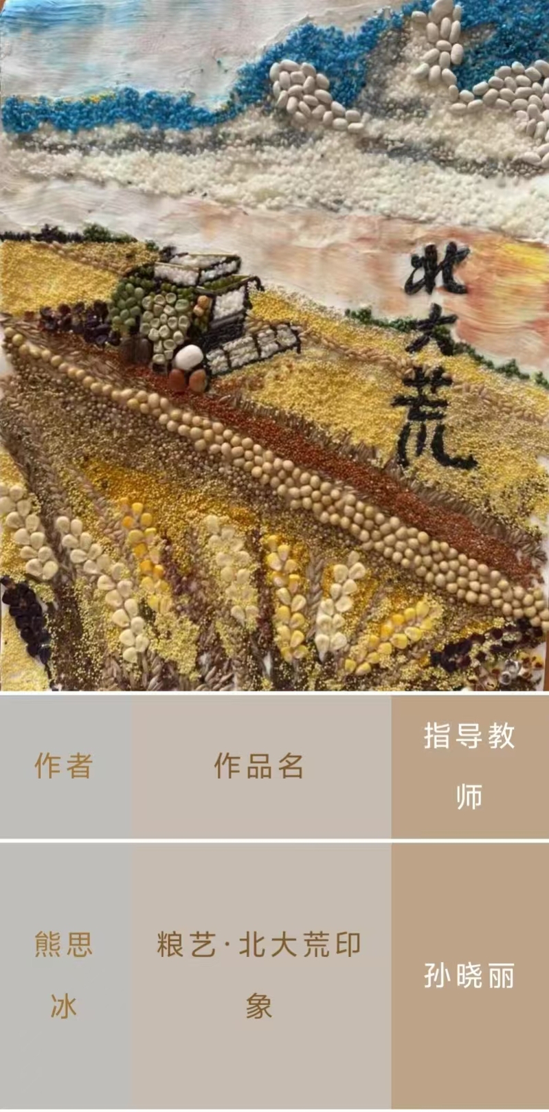 这幅粮食粘贴画以“北大荒”为主题,创作者巧妙利用五谷杂粮,将北大荒的独特风貌呈现。北大荒曾是荒芜之地,如今是富饶的“北大仓”,承载着农垦历史与丰收希望。创作时,创作者选取 多种粮食,如金黄的小米模拟麦浪,饱满的豆子拼出收割机,蓝色谷物勾勒天空,借粮食天然色彩与形态,还原北大荒的田野、机械与天际线• 画面中,广袤田野铺满金黄、棕褐等色彩的粮食,展现丰收的厚重;收割机由多彩豆子组成,是现代 农业的象征;上方蓝天白云用不同色泽谷物拼贴,增添空间感。“北大荒”三字以黑色粮食呈现,点明主题。这幅作品以粮食为媒介,不仅是艺术创作,更传递对北大荒从荒到仓变迁的致敬,让观者透过粮食颗粒,感受这片土地的历史与生机,体会劳动与丰收的意义,是创意与农垦文化融合的生动体现。