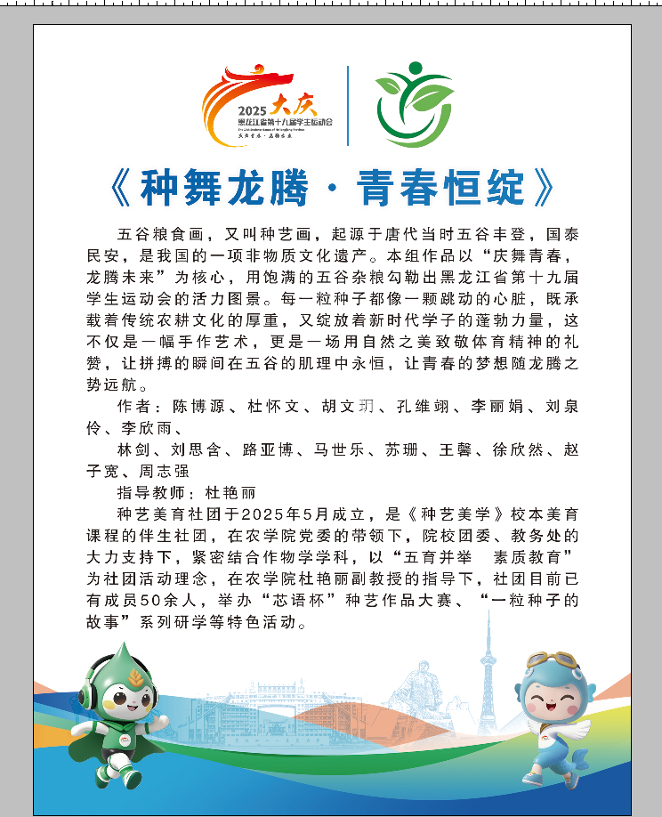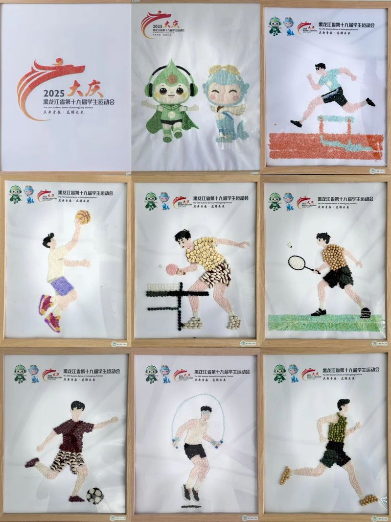 恰逢黑龙江省第十九届学生运动会在买球赛的app官网盛大启幕,实践队立足农学类专业优势,以 “献礼学运” 为核心,精心策划并开展 “省学运会” 主题种艺画创作活动。队员们以饱满的热情将五谷种子化作灵动 “画笔”,于方寸画布间巧思布局、精细拼贴。一幅幅作品跃然眼前,既有运动健儿驰骋赛场的动感瞬间,亦有可爱的吉祥物“庆庆”“飞飞”,将体育精神的激昂与青年学子的赤诚鲜活呈现。