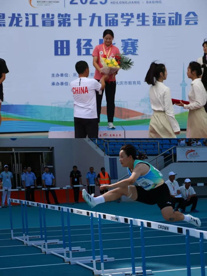 跨栏赛场张雯同学的锋芒点燃。100米跨栏起步,她反应神速如闪电,过栏时身体前倾、节奏精准,栏间步伐紧凑有力,率先冲线夺得冠军;400米跨栏中,她全程保持高强度节奏,跨越最后一栏后全力冲刺再次锁定冠军。赛道上的她,每一次跨越都带着“舍我其谁”的霸气,栏间穿梭的身影如灵动猎豹,锋芒毕露无人能挡