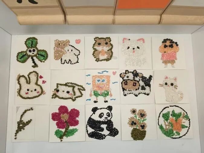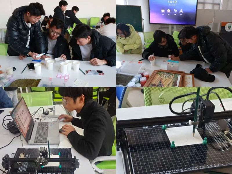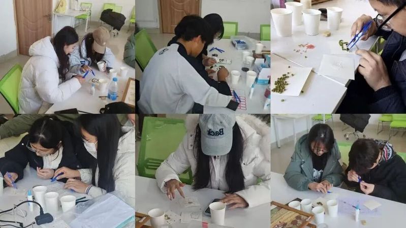 本次实训的一大亮点是传统手工艺与现代科技的巧妙结合。种艺美育社团不仅准备了谷物、豆类等丰富的自然材料,还引入了写字机器人辅助完成精细的文字绘制。此举不仅提升了作品的精度与创意,更让参与者亲身体验了“农科+美育+科技”的跨界融合魅力,深化了对农业资源多元价值的理解。