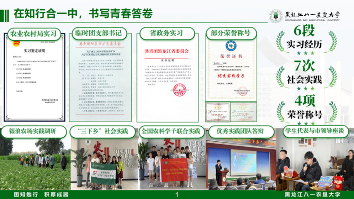 以自身的新媒体技能特长,两次在共青团黑龙江省委实习进行新媒体线上实习,参与省团委公众号运维,制作推文60余条,部分原创内容推文累计浏览量破十万,获评“优秀实习生”。