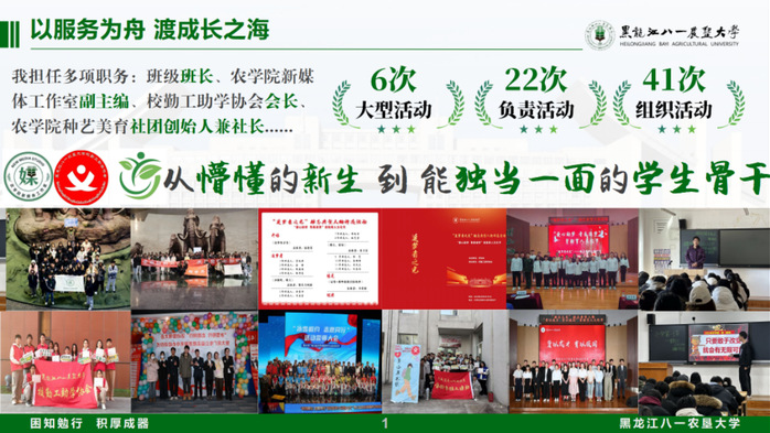 以服务为舟,渡成长之海。他在多个学生骨干岗位上倾情奉献,从懵懂的新生成长成能独当一面的学生骨干。