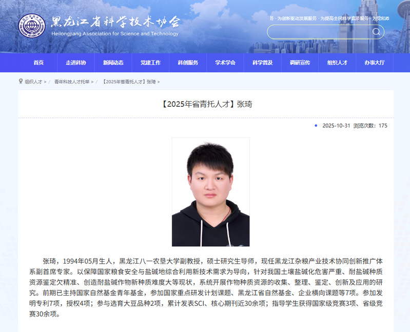 张琦入选黑龙江省青年科技人才托举工程项目