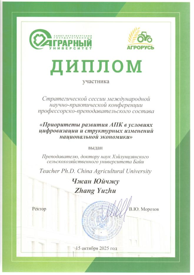 在学术影响力塑造上,学院教师在国内外重要学术会议中进行汇报。受俄罗斯圣彼得堡国立农业大学邀请,买球赛的app官网教师张雨竹线上参加了2025年国际农业工业展览会“农业俄罗斯”学术交流活动,并以“Plant PAQR-like sensors stimulate heterotrimeric G-proteins to confer resistance against multiple pathogens”为题作学术报告,为俄罗斯提供被动应对式的病害治理转向主动预判、前置防护的病害防控中国新模式。